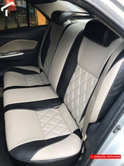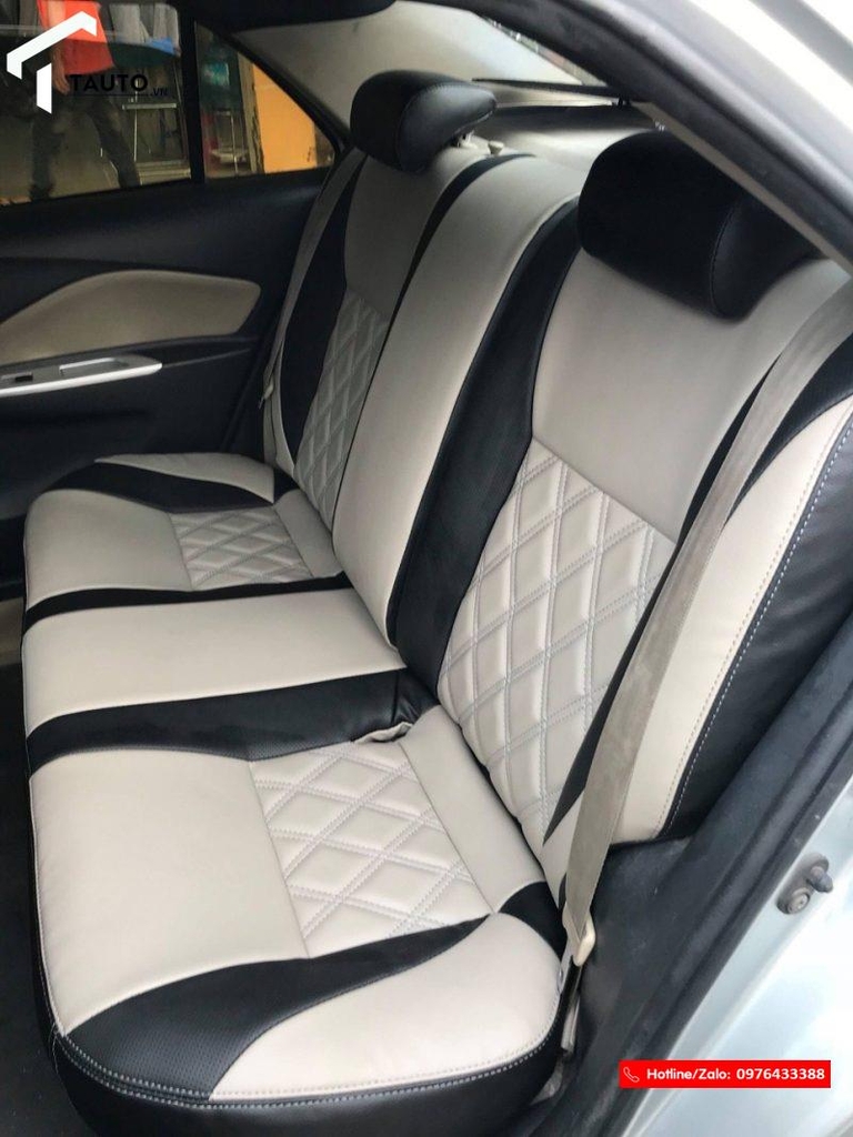 May bọc ghế chia làm 2 phần, phần trước màu kem, vừa sáng xe vừa tăng lên vẻ sang tọng, đằng sau và mép là màu đen, vừa sạch sẽ mà tạo được điểm nhấn khá hoàn hảo.