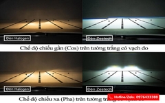 Ảnh so sánh đèn Halogen và đèn Zestech trên tường trắng có vạch đo
