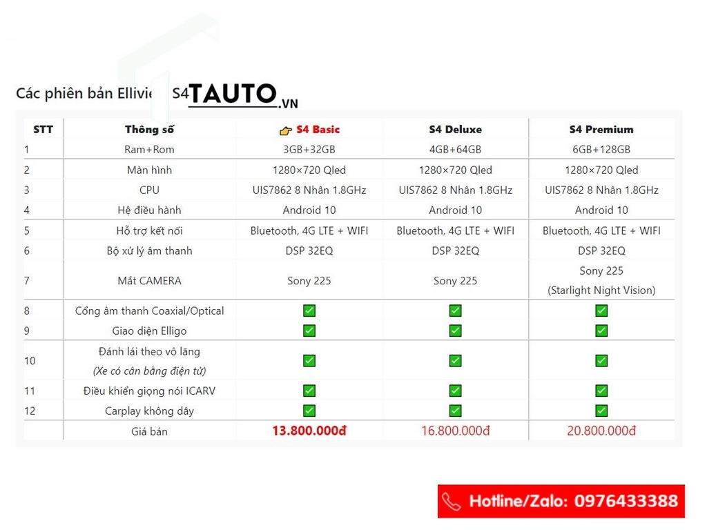 Màn Android Elliview S4 Premium [6GB/128GB+CAM360 +Carplay]. Elliview S4 Premium là phiên bản màn hình android cơ bản nhất trong S4 Serial. Sở hữu cấu hình đủ dùng với 6GB+128GB/ CPU 8 core 1.8Ghz, trang bị nhiều tính năng hữu ích. Sản phẩm cũng được trang bị sẵn hệ thống CAMERA 360 độ siêu nét.