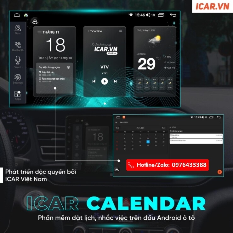 Ứng dụng ICAR Calendar sẽ là một trợ lý đắc lực, giúp bạn không quên bất kỳ lịch trình gì. Ứng dụng này có cả trên điện thoại kết nối với màn hình ô tô, bạn chỉ cần note trên điện thoại, đến lịch trình khi khởi động xe sẽ hiện lên những việc đã note trong ngày. Với những người có lịch làm việc dày đặc và thường xuyên di chuyển trên xe ô tô thì ICAR Calendar là một người bạn đồng hành hỗ trợ nhắc việc tuyệt vời.